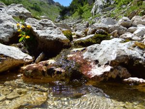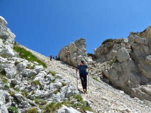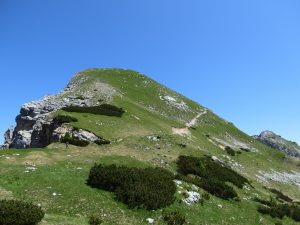 Nakon kraće stanke na vrhu, par fotki i ruksak-gableca nastavljamo s drugim, i po mom mišljenju, zanimljivim dijelom izleta preko Srenjskog prevala (sedla) prema Studorskom prevalu. Tu započinje pravi alpski ambijent sa stjenovitim terenom, siparom te pokojom sajlom i klinovima. Anji je to bio pravi doživljaj pošto joj je to bio prvi alpski izlet i, čini se, nikako zadnji. Na pola puta otvara se spektakularni pogled prema dolini Krme, a u blizini su se našli i ostaci proljetnog snijega. Bojan je naravno odlučio ohladiti umorne noge u tom snijegu i iskreno nije se činilo da mu je bilo neko ugodno iskustvo 😊.