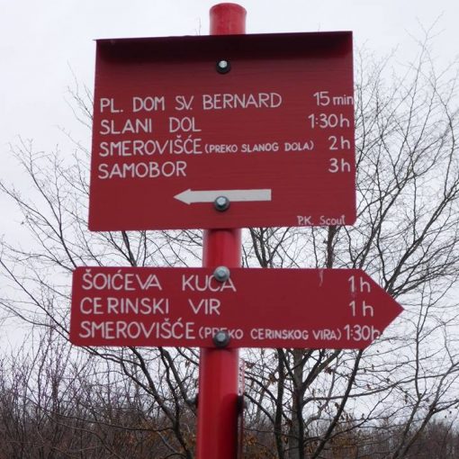 Slani dol taman na granici oblaka i sunca. Oblaci dole, sunce gore, pogledi lijevo i desno, pod nogama lišće, a u zraku friški povjetarac. Uvjeti fenomenalni za planinarenje. Trasa izleta vodi nas grebenom koji je smješten između dolina Slapnice s jedne strane i Bregančice s druge strane. Tura je bila lagana jer nema puno uspona na stazi. Odmorili smo kratko na uobičajenom mjestu “Štahanovoj vikendici“. Grupa nam je bila jako velika pa smo se stiskali i rastezali poput gusjenice ili harmonike. Okupili smo se na kup opet neposredno prije planinarske kuće Gostinjac, Sv. Bernarda. U kući je bilo živo jer su domaćini uređivali okoliš, a mi smo začinili atmosferu sa dodatnim brbljanjem, skakanjem, igranjem, klopanjem.